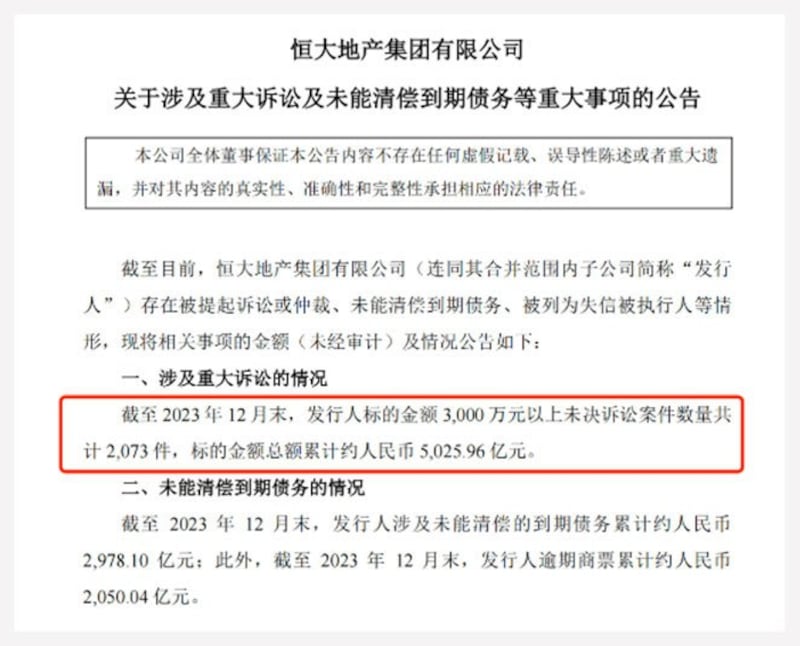 恒大集团遭香港高等法院颁布清盘令后,其债务危机对整体中国经济的影响日趋显现。该公司周五发布最新公告显示,截至去年十二月底,恒大涉及未能清偿的到期债务累计约人民币近三千亿元。