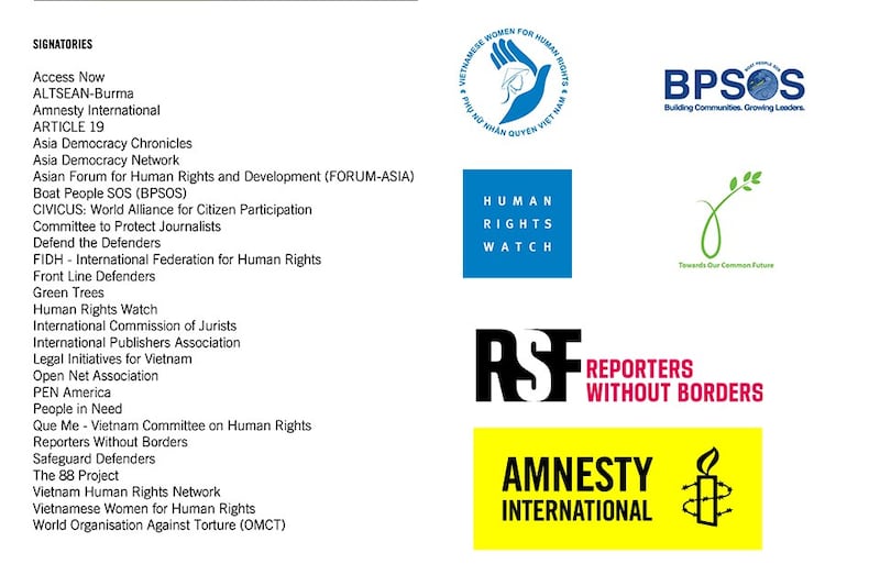 Sau cùng, họ cũng đòi nhà nước Việt Nam bãi bỏ các điều luật thường được sử dụng để đàn áp những cá nhân bất đồng với nhà nước, như người hoạt động nhân quyền hay nhà báo.
